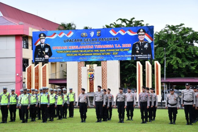 KUPANG, fokusnusatenggara.com  —  Kepolisian Daerah Nusa Tenggara Timur (Polda NTT) menggelar Apel Gelar Pasukan dalam rangka Operasi Keselamatan Turangga Tahun 2026 dengan tema “Terwujudnya Kamseltibcarlantas yang Aman, Nyaman dan Selamat Menjelang Pelaksanaan Ops Ketupat-2026”. Kegiatan berlangsung di Lapangan Mapolda NTT, Senin (2/2/2026).