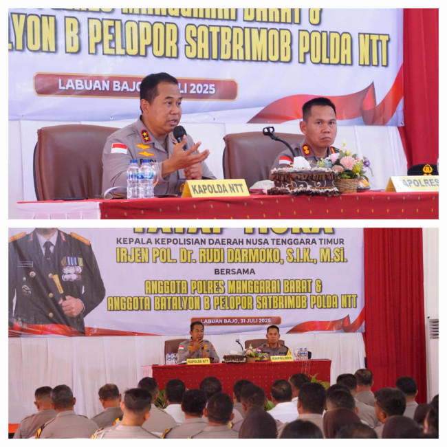 LABUAN BAJO,fokusnusatenggara.com.com — Dalam rangkaian kunjungan kerja di Kabupaten Manggarai Barat, Kapolda NTT Irjen Pol Dr. Rudi Darmoko, S.I.K., M.Si., melaksanakan kegiatan tatap muka bersama personel Polres Manggarai Barat dan Brimob Batalyon B Pelopor, Kamis (31/7/2025) siang.