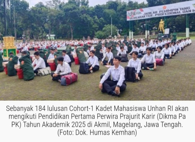 JAKARTA, fokusnusatenggara.com   Sebanyak 184 lulusan Cohort-1 Kadet Mahasiswa Universitas Pertahanan Republik Indonesia (Unhan RI) akan mengikuti Pendidikan Pertama Perwira Prajurit Karir (Dikma Pa PK) Tahun Akademik 2025 di Akmil, Magelang, Jawa Tengah. Pendidikan akan dimulai tanggal 7 Januari 2025.