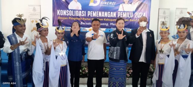 Kehadiran Calon Gubernur NTT Simon Petrus Kamlasi bersama Ketua Teritori Partai Nasdem Provinsi NTT, Julie Sutrisno Laiskodat serta para pengurus partai Nasdem NTT untuk mengikuti konsilidasi Partai Nasdem di Sumba Barat Daya terkait pemenangan pilkada 2024.