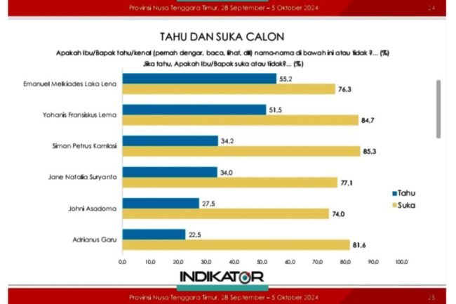 Simon Petrus Kamlasi menjadi figur paling disukai dengan presentasi 85,3 persen, menyusul Ansy Lema di posisi kedua dengan 84,7 persen dan Melki Laka Lena 76,3 persen.