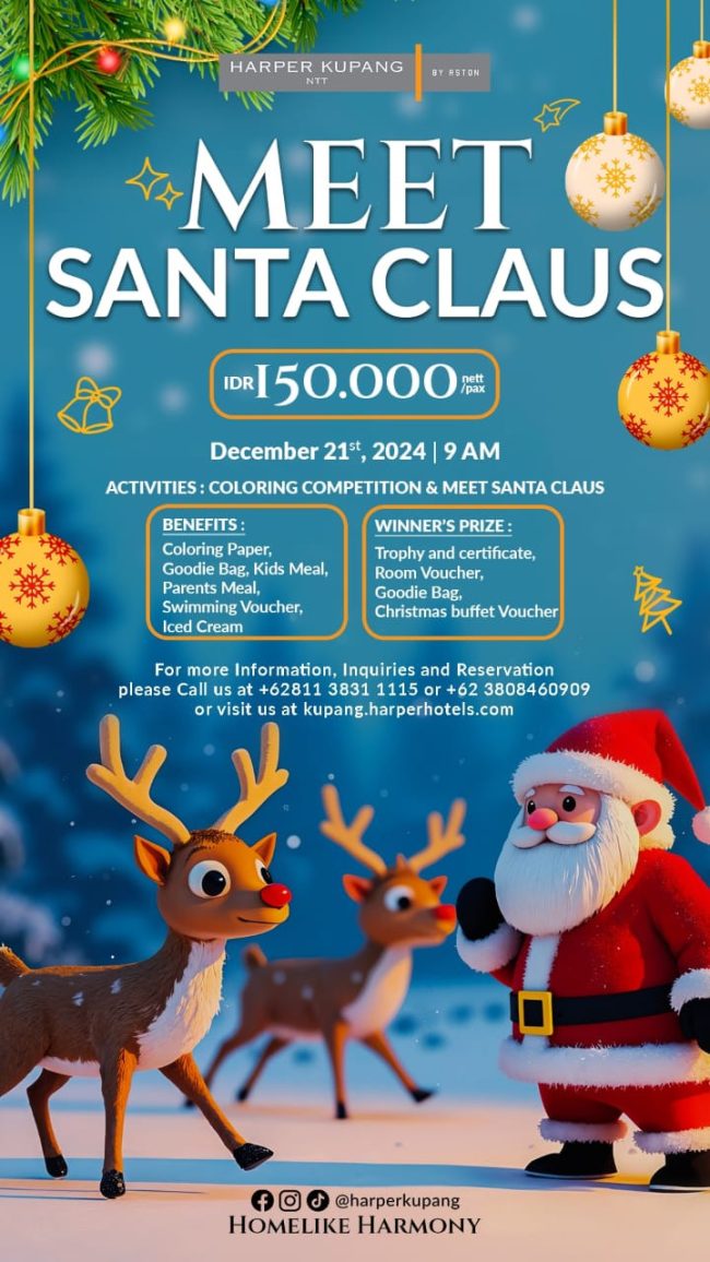 KUPANG, fokusnusatenggara.com – Harper Hotel Kupang kembali menghadirkan momen spesial untuk anak-anak dan keluarga melalui kegiatan Meet Santa Claus pada tanggal 21 Desember 2024. Acara ini menggabungkan aktivitas lomba mewarnai dengan pertemuan seru bersama Santa Claus. Dengan biaya Rp150.000 nett per anak, peserta tidak hanya dapat menikmati berbagai aktivitas menyenangkan, tetapi juga mendapatkan manfaat berupa goodie bag, makanan untuk anak dan orang tua, swimming voucher, serta es krim.