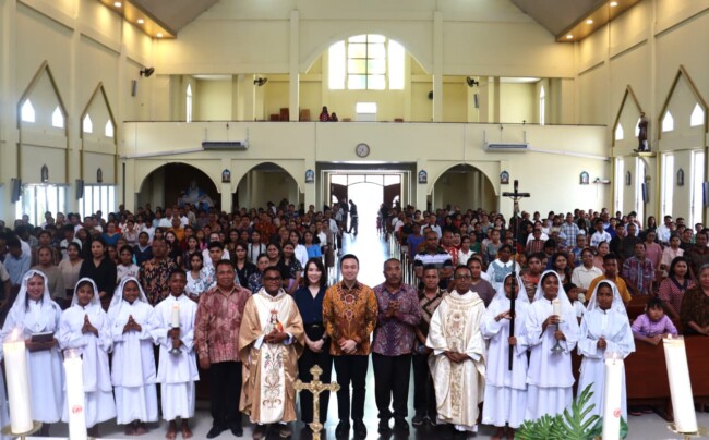 KUPANG, fokusnusatenggara.com — Wali Kota Kupang, dr. Christian Widodo, menyerahkan bantuan sosial senilai Rp 100 juta untuk pembangunan Gereja Kuasi Paroki St. Andreas Lasiana pada Minggu (23/11/25). Penyerahan dilakukan bertepatan dengan Misa Hari Raya Kristus Raja Semesta Alam yang dirangkaikan dengan peringatan Hari Orang Muda Sedunia, dipimpin oleh Pater Metodius Bria, CMF.